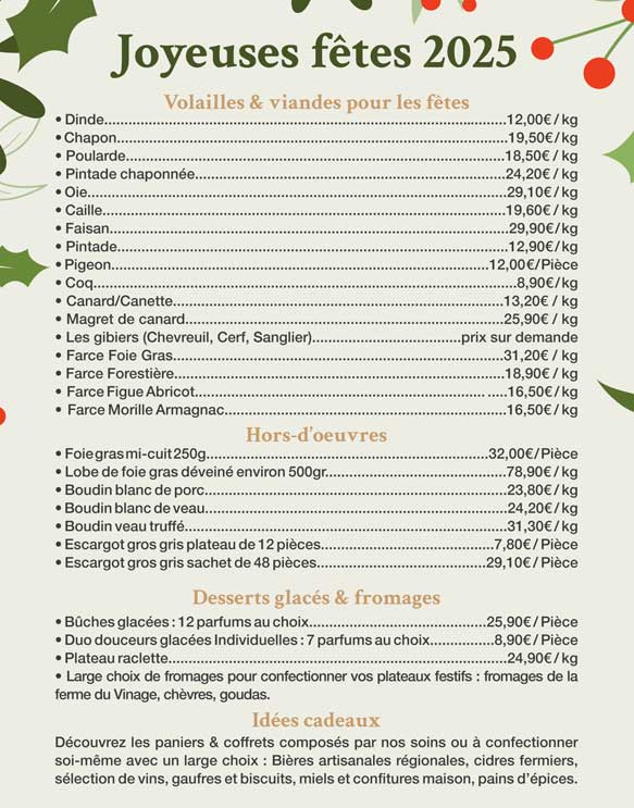 Comme chaque année, pour les fêtes de fin d'année, nous vous proposons les volailles festives de qualités sélectionnées par nos soins (dindes, chapons, poulardes, pintades chaponnée, oies, cailles, faisans).